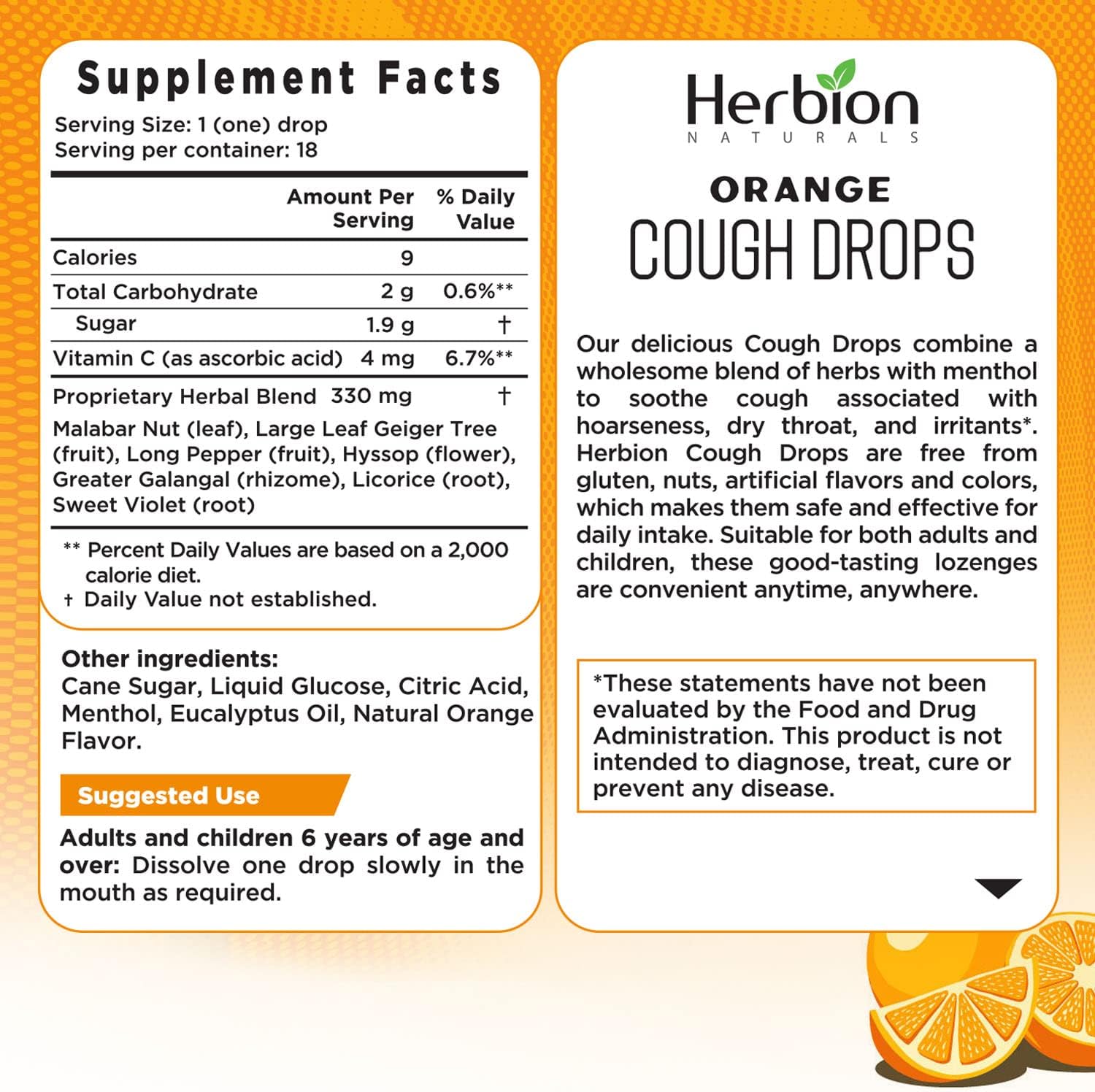 Orange-flavoured lozenges crafted with carefully selected botanicals such as Malabar Nut, Long Pepper, Hyssop, Licorice, and more.